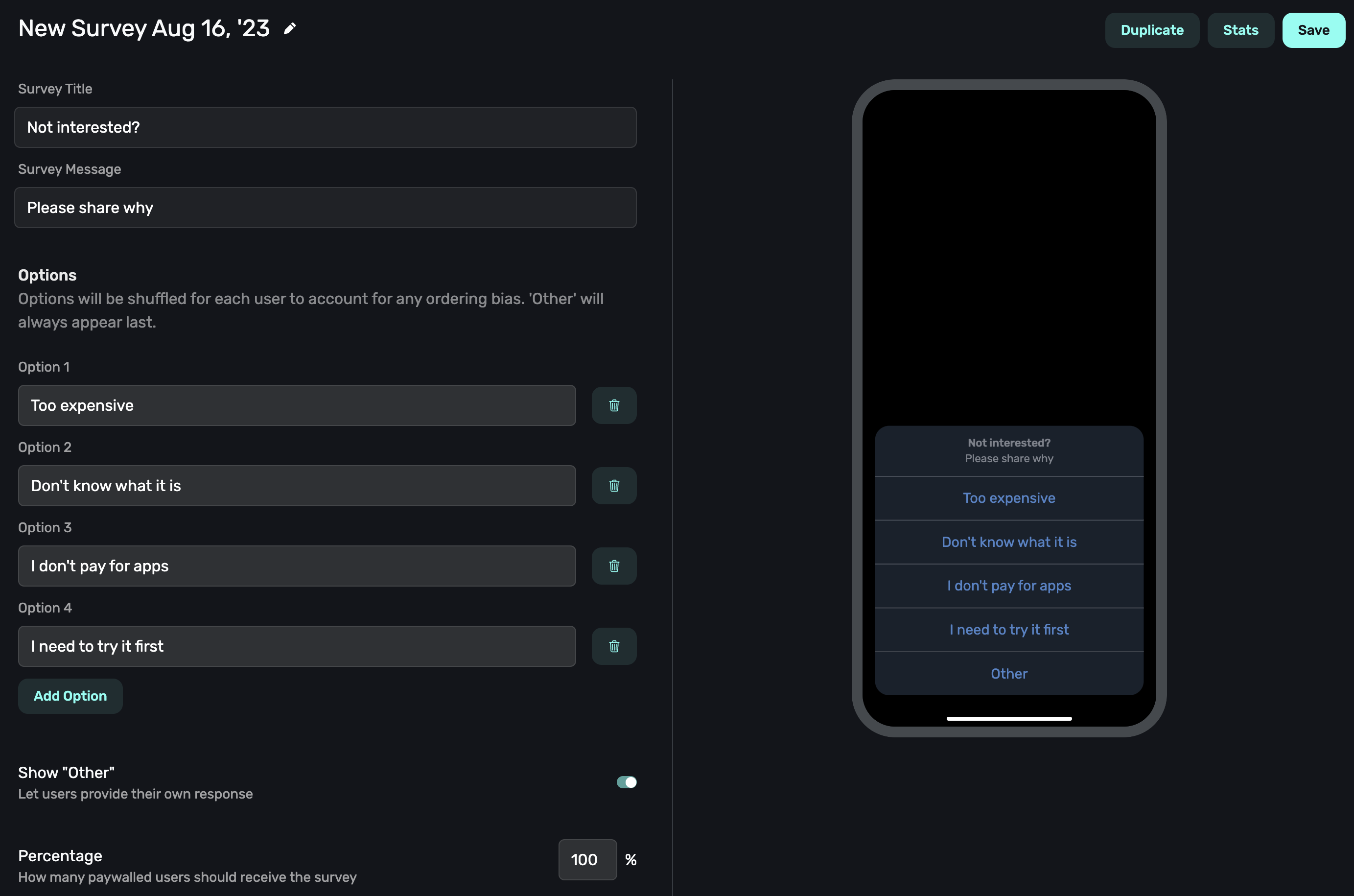 No matter how much you optimize flows, designs or copy — the truth is that, statistically speaking, the majority of users will not convert. Finding out why is key, and you can do that with our surveys that you can attach to any paywall.